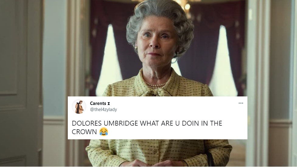 She is an actress, known for harry potter and the order of the phoenix (2007), shakespeare in love (1998) and pride (2014). Netflix releases first image of imelda staunton as queen elizabeth ii in the crown. Sold by sparks dvd sales and ships from amazon fulfillment. July 30, 2021 at 11:24 am edt. The first image of imelda staunton portraying the queen in the fifth series of the crown has been released. The netflix show took to twitter on friday to upload a snap of the actress. Production got underway on left bank pictures' lavish royal drama in the uk this month, with a. Buy the selected items together. Fans of the crown are getting a first look at imelda staunton as she prepares for her turn as queen elizabeth ii on the fifth season. Netflix has released its first look at imelda staunton as queen elizabeth ii for season 5 of the crown. Netflix has dropped a first look at imelda staunton as queen elizabeth ii in season 5 of the crown. On friday, the crown 's official instagram released the first. Imelda staunton is a british actress who portrays dolores umbridge in the film adaptation of harry potter and the order of the phoenix and harry potter and the deathly hallows: